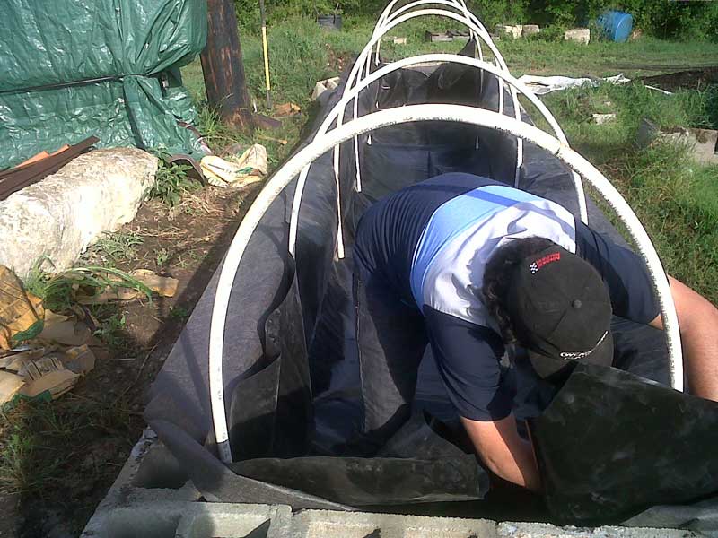 The liner is installed using PVC hoops to temporarily hold it against the retaining walls.
